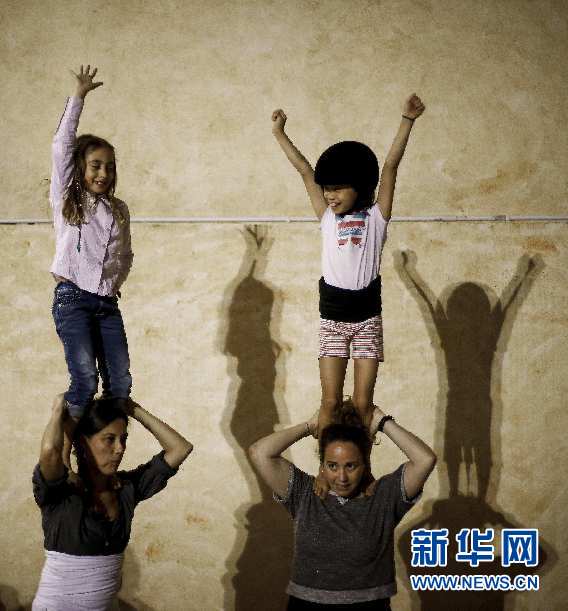 Jana(右上)踩在养母Thais(右下)肩上进行最基本的“叠人塔”训练。新华社巴塞罗那分社摄影师Pau Barrena 摄