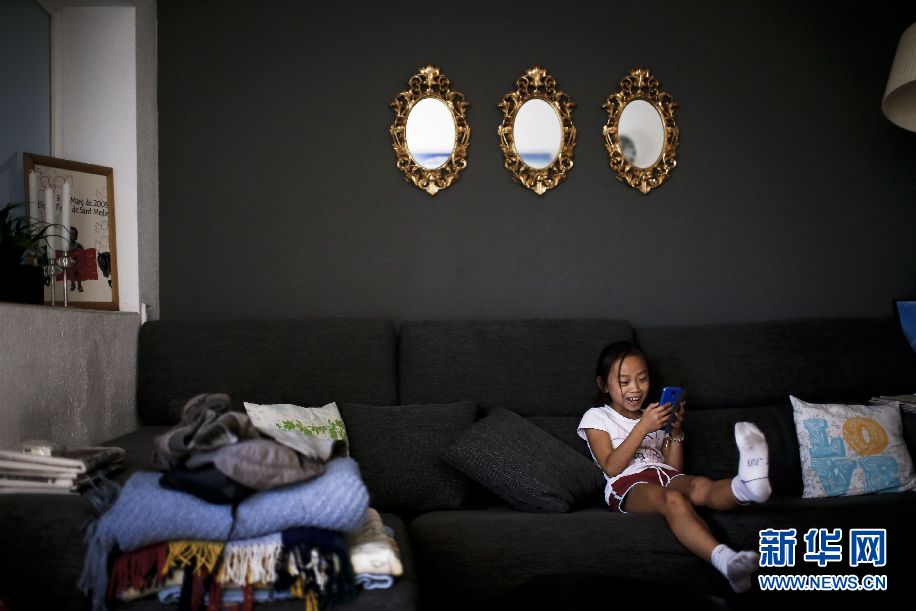 Jana坐在家里的沙发上玩养母Thais的智能手机。新华社巴塞罗那分社摄影师Pau Barrena 摄