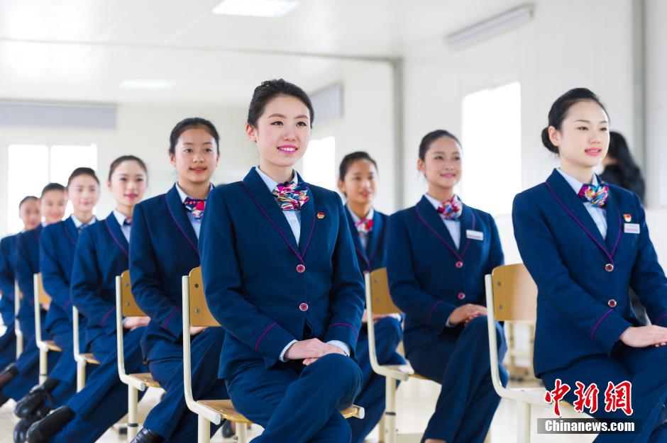 2014年11月19日,贵(贵阳)广(广州)高铁开通在即,贵阳客运段动车组列车乘务员正在进行礼仪训练。贵阳客运段做好开行动车组列车准备工作,贵广高铁“准动姐”们抓紧进行动车乘务员服务礼仪、双语播音等业务知识培训。图为坐姿训练。 贺俊怡 摄