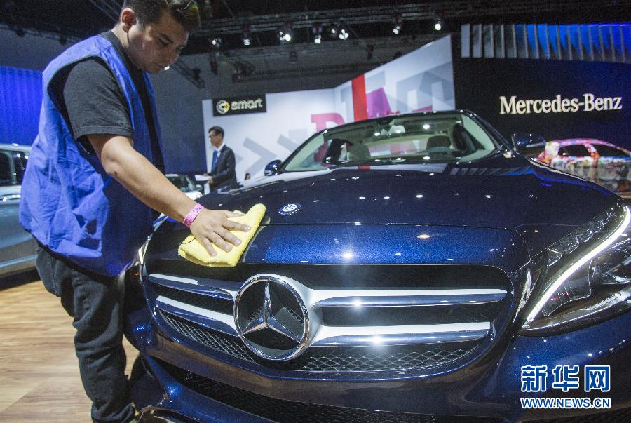 11月19日,在美国洛杉矶会展中心,一名工人正在擦拭奔驰公司的新款C300。洛杉矶车展当日开展并向媒体开放,本月21日至30日向公众开放。超过50款新车在车展上全球首发。 新华社发(赵汉荣摄)