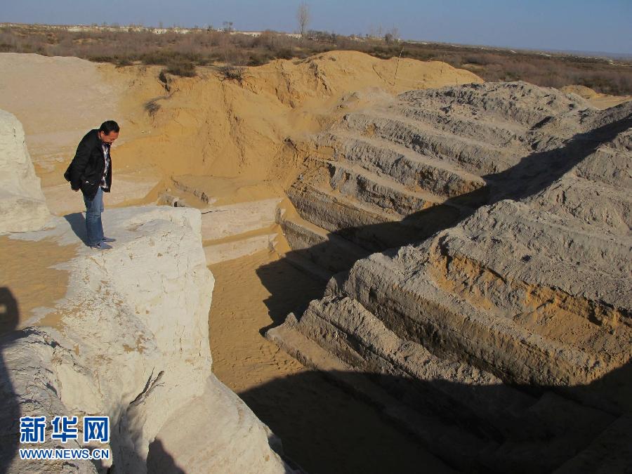 一名考古专家站在城墙上向下看西城门及其瓮城(11月20日摄)。经过4个多月的考古发掘,陕西省考古研究院的文物专家们首次给世人完整呈现出匈奴故都——统万城的西城门及其瓮城的整体结构资料。专家认为,这不仅首次展现出了统万城的完整城防体系,而且对研究中国古代城市发展史等均具有重要意义。新华社发
