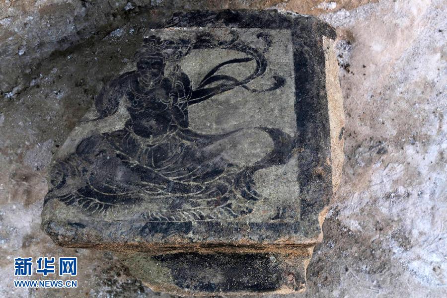 统万城考古首次完整呈现城门及其瓮城时出土的“飞天”石刻(9月20日摄)。经过4个多月的考古发掘,陕西省考古研究院的文物专家们首次给世人完整呈现出匈奴故都——统万城的西城门及其瓮城的整体结构资料。专家认为,这不仅首次展现出了统万城的完整城防体系,而且对研究中国古代城市发展史等均具有重要意义。新华社发