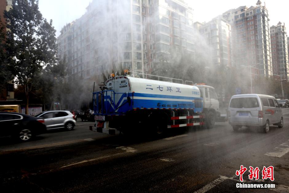 11月21日,郑州街头,一辆白色洒水车“顶着一头雾水”行驶。近日,郑州市内各区对洒水设备进行了更新改造,安装了高压细水雾装置。将以前喷水的洒水车改为喷雾,水雾喷向高空,将高空中悬浮的颗粒状灰尘等物质黏附下来,可以使道路局部环境有所改观。图为,11月21日,郑州街头,一辆白色洒水车“顶着一头雾水”行驶。 杨正华 摄