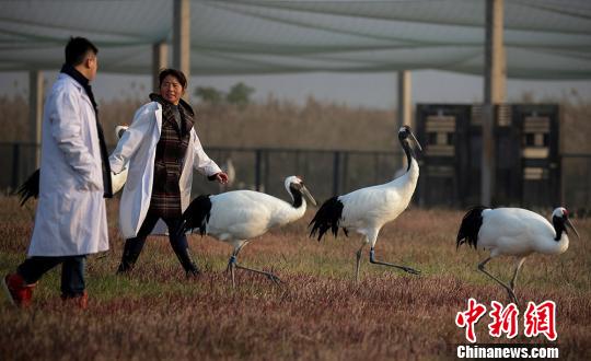 饲养员准备放飞圈养丹顶鹤。 泱波 摄