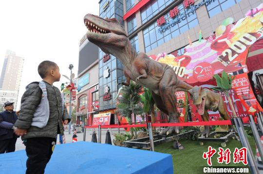 11月20日,郑州街头,会叫的“恐龙”吸引众多市民驻足观看。 杨正华 摄