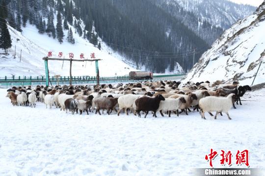 图为20日牧民经过果子沟牧民转场专用的牧道。李亚峰 摄