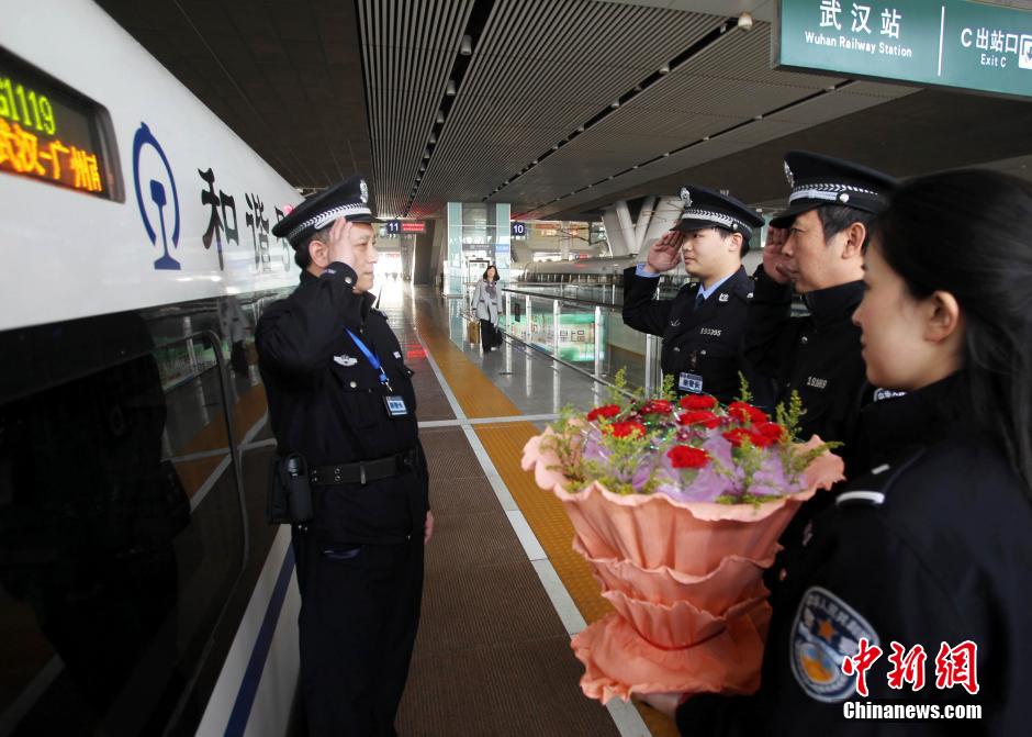 11月20日是武汉铁路公安局乘警张东贺60岁的生日,他在这特殊的日子值乘高铁G1119次列车,执行完这趟最后一班任务后,他将正式退休。尽管没有庆功宴,也没有太多的关注与掌声,但这平凡的最后这一天班,正是老张最想要的退休礼物。张东贺于1980年参加公安工作,1988年6月被调到乘警队,从警至今已30余年,期间在许多列车线路上执行过值乘任务,足迹遍布全国各地。图为张东贺准备登上列车前,与前来送行的同事敬礼道别。 中新社发 赵军 摄