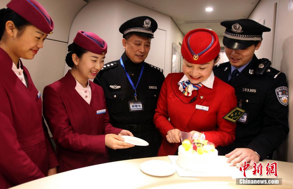 11月20日是武汉铁路公安局乘警张东贺60岁的生日,他在这特殊的日子值乘高铁G1119次列车,执行完这趟最后一班任务后,他将正式退休。尽管没有庆功宴,也没有太多的关注与掌声,但这平凡的最后这一天班,正是老张最想要的退休礼物。张东贺于1980年参加公安工作,1988年6月被调到乘警队,从警至今已30余年,期间在许多列车线路上执行过值乘任务,足迹遍布全国各地。图为武汉开往广州南的G1119次旅客列车上,乘务人员一起为老张(中)庆祝60岁生日。 中新社发 赵军 摄