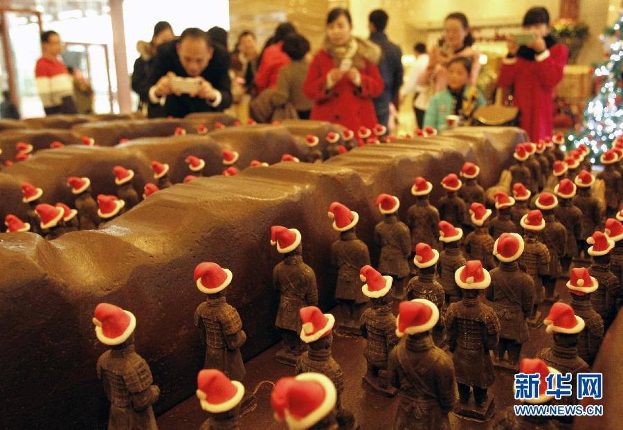 这是11月23日拍摄的巧克力兵马俑。为迎接圣诞节,陕西西安香格里拉大酒店的10个甜点师用10天时间、200斤巧克力创作完成近300个戴圣诞帽的微缩兵马俑模型日前在酒店集体亮相,吸引了公众的目光。新华社发(焦宏涛 摄)