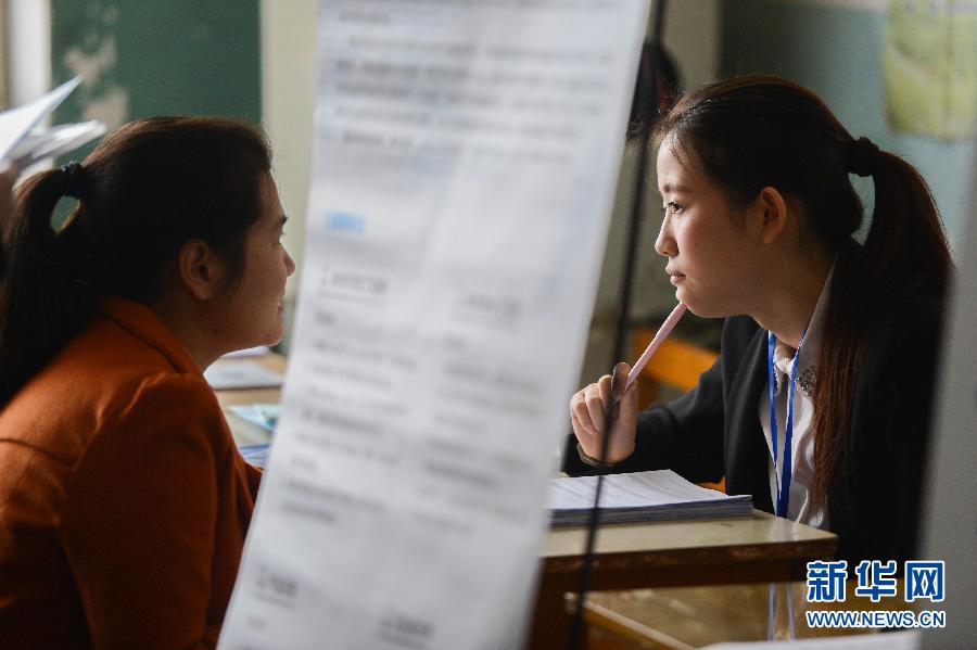 11月23日,在合肥工业大学招聘现场,一名求职大学生(左)与用人单位洽谈。当日,安徽省合肥工业大学2015届毕业生就业洽谈会在校园里举行,现场共有365家用人单位参与此次招聘,吸引了众多应届毕业生前来求职。新华社记者 张端 摄