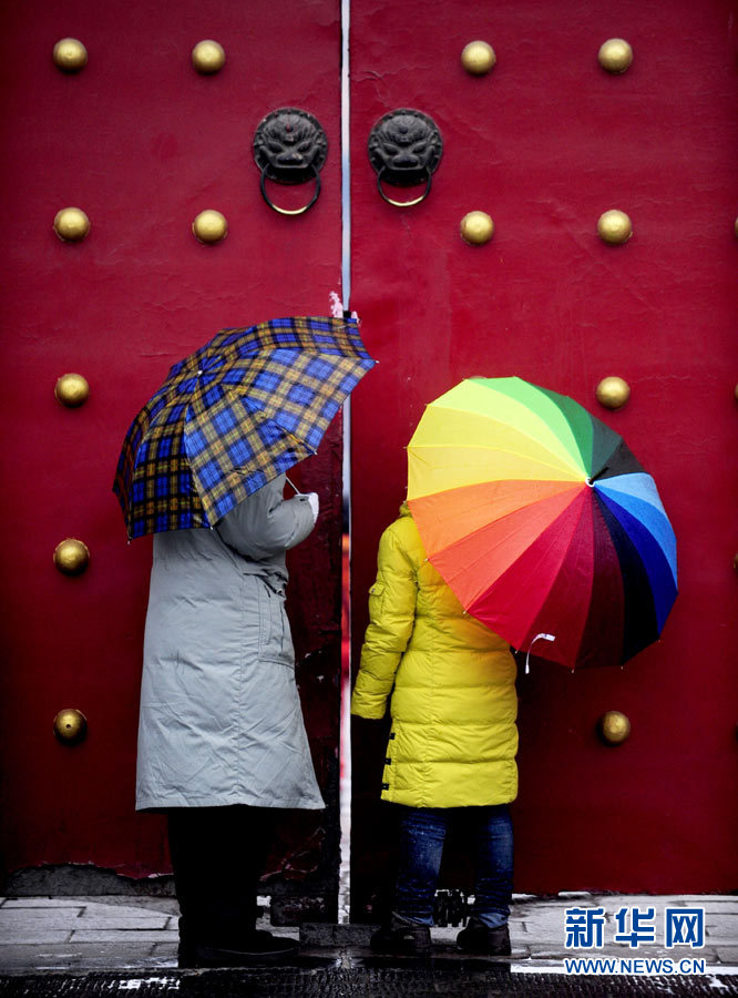 11月16日,一场冬雨降临沈阳,两名市民打着伞在沈阳故宫门口张望。 新华社发(张文魁摄)