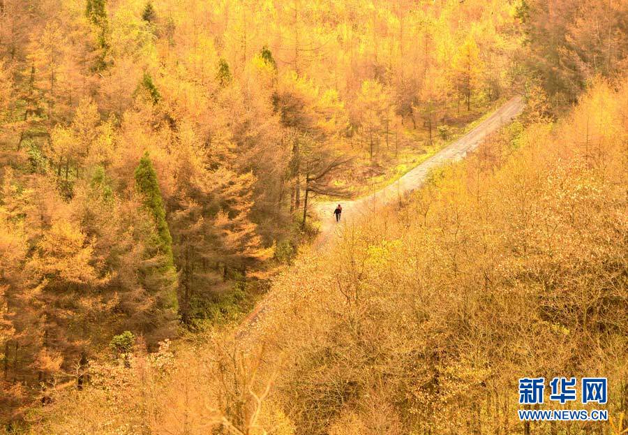 11月12日,游人在湖北省建始县长岭岗林场的林间行走。眼下,建始县长岭岗林场漫山遍野的落叶松被寒风染黄,犹如满山尽披“黄金甲”。 新华社发(杨顺丕 摄)