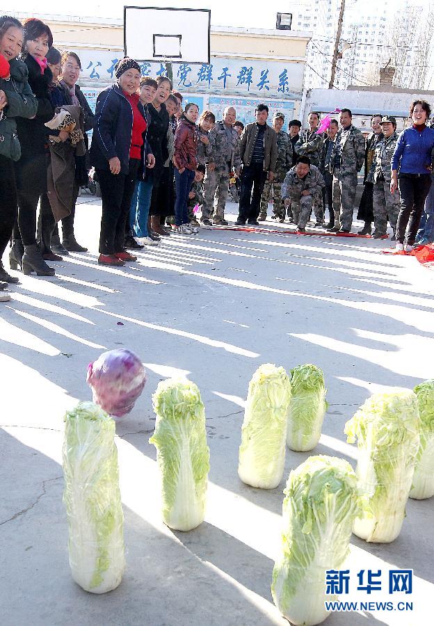 11月24日,新疆哈密西河区街道东菜园村村民在进行蔬菜保龄球比赛。当日,新疆哈密西河区街道东菜园村开展“蔬菜”主题运动会,百余名菜农参加了搬运白菜、吃西红柿、蔬菜保龄球、举白菜等富有农村特色的比赛,分享丰收和运动的快乐。新华社发(普拉提 摄)