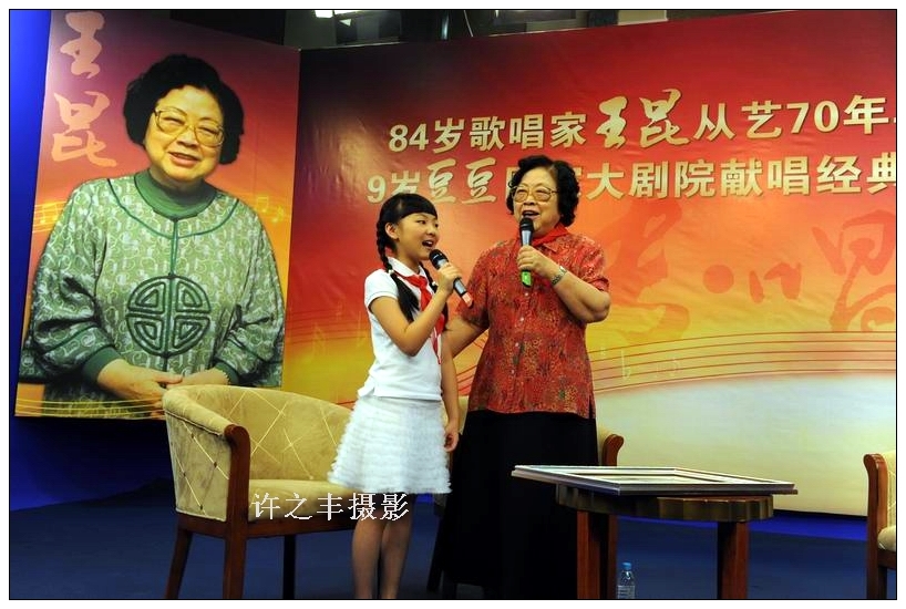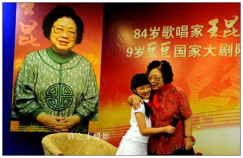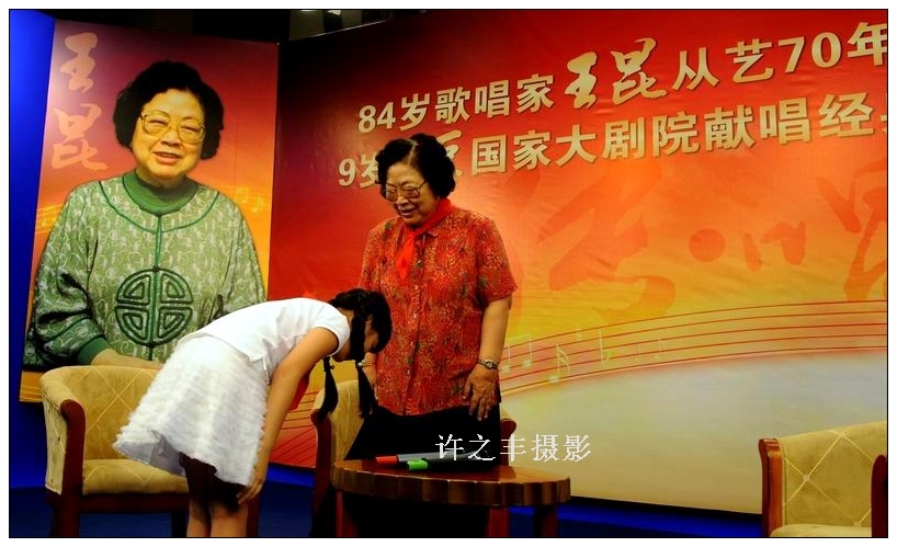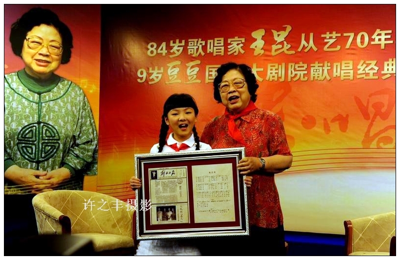 2014年11月21日,深受爱戴的著名艺术家、原东方歌舞团团长、中国东方演艺集团艺术顾问王昆在京逝世,享年89岁。她是中国新歌剧的第一代演员,《白毛女》第一个“喜儿”,那个梳着大辫子、唱着“北风那个吹,雪花儿那个飘”的喜儿,也永远地离开了我们。她的代表作《南泥湾》、《翻身道情》、《农友歌》、《秋收》、《兄妹开荒》、《夫妻识字》等,伴随几代中国人成长。1982年,王昆被任命为东方歌舞团团长,在东方歌舞团时,她培养大批优秀音乐人才,推动了中国流行音乐的发展创造了辉煌业绩。作者用一组著名歌唱家王昆在84岁时在北京收下“关门弟子”照片,纪念这位从延安时期的老演员从事革命文艺工作70余年。用一首“花篮的花儿香,听我来唱一唱,来到了南泥湾,南泥湾好地方……”歌词纪念这位泰斗级歌唱家王昆。工人日报-中工网记者许之丰摄影报道