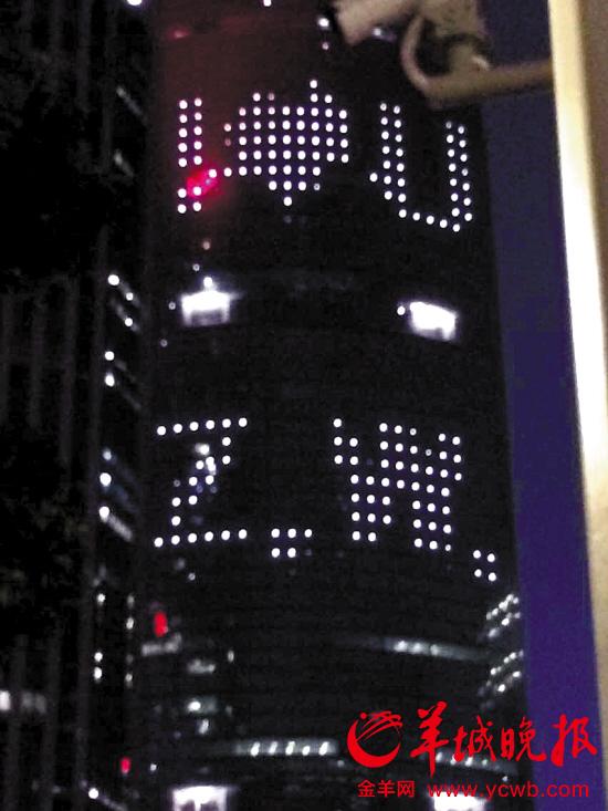 羊城晚报讯记者赵晨报道:如今,示爱方式五花八门,传统的鲜花美酒、烛光晚餐已难入“富二代”法眼。昨晚,广州珠江新城珠江城大厦突现巨大示爱广告“I U,ZW”,羡煞一众白领男女。据传,该广告客户是一名20岁左右的后生仔,共花费不到10万元。有网友调侃:“大楼的LED灯都被你承包啦!有钱,任性!”