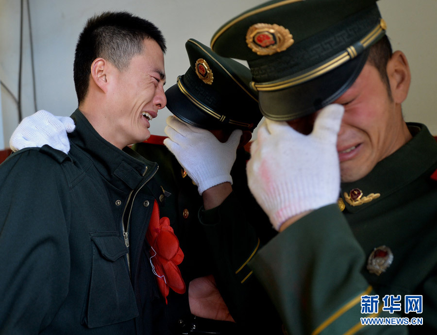 11月25日,在辽宁省朝阳市火车站,武警退役战士相拥告别。当日,驻辽宁省朝阳市某武警部队首批退役战士满含深情告别军营和第二故乡,开始新的人生旅程。 新华社发(白铁军 摄)