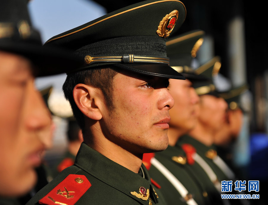 11月25日,在辽宁省朝阳市火车站,执勤的武警战士眼含热泪,目送战友离开。当日,驻辽宁省朝阳市某武警部队首批退役战士满含深情告别军营和第二故乡,开始新的人生旅程。 新华社发(白铁军 摄)