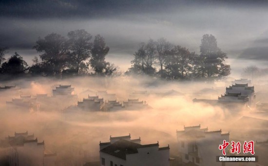 11月24日消息,初冬时节,江西省婺源县山村枫林尽染,徽派民居在炊烟中若隐若现,宛如仙境,美不胜收。中新社发 胡敦煌 摄