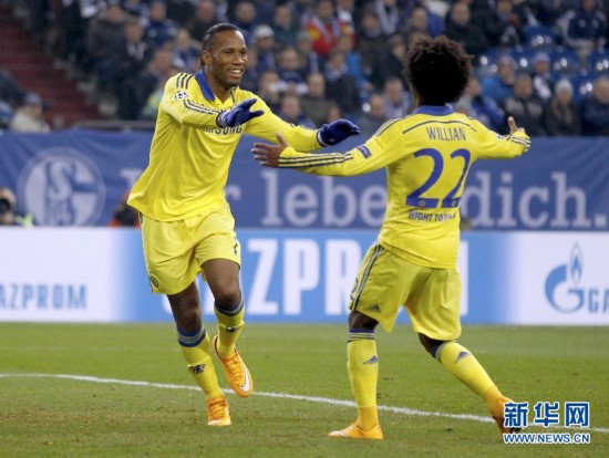 11月25日,切尔西队球员德罗巴(左)与队友威廉庆祝进球。当日,在2014-2015赛季欧洲足球冠军联赛G组比赛中,英超切尔西队客场以5比0战胜德甲沙尔克04队。 新华社/路透