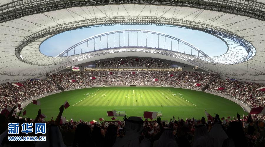 这张于11月24日从卡塔尔2022年世界杯最高委员会(赛事组织方)获得的电脑绘制效果图展示了翻新后的卡塔尔世界杯赛场之一——哈利法国际体育场的内景。新华社/法新