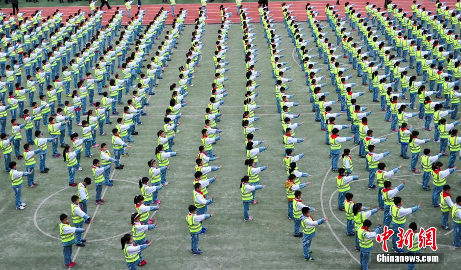 11月25日,小学生课间做“小交警韵律操”锻炼身体。当日,济南舜耕小学700余名小学生身着荧光衣,在课间做以交通警察指挥手势编排成的“小交警韵律操”,健身的同时熟知交通安全法规。中新社发 张勇 摄