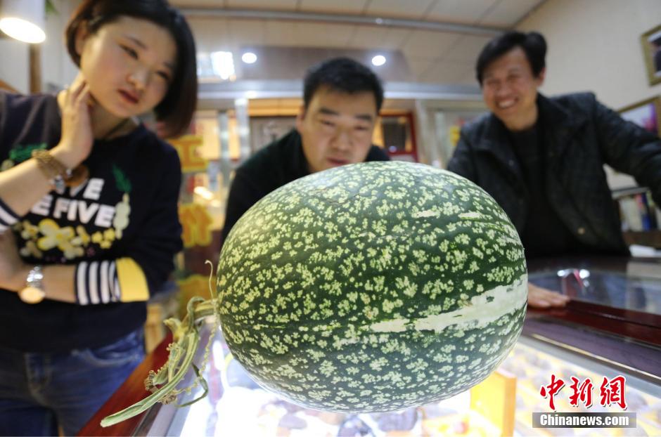 11月25日,河南郑州,一位女士在展示奇特的“怪瓜”。近日,郑州市民杜先生到焦作太行山区旅游时带回一个奇特的“怪瓜”—— 外形似西瓜,有着葫芦的秧藤,西瓜的瓤,冬瓜的籽,皮上长着雪花斑纹。这只瓜直径19公分,长24公分,重4.1公斤。中国农业科学院郑州市果树研究所研究员马双武看后认为,“怪瓜”名叫黑籽南瓜,为多年生蔓性草本植物,原产中美洲至南美洲海拔较高的山谷里,生长环境极为严格,日照在13小时以上的地区或季节不会形成花芽,极为稀有。河南境内的太行山上发现黑籽南瓜,还是首次,说明当地的气候条件适合它的生长环境,作为地方资源开发有着重要的价值。中新社发 杨正华 摄