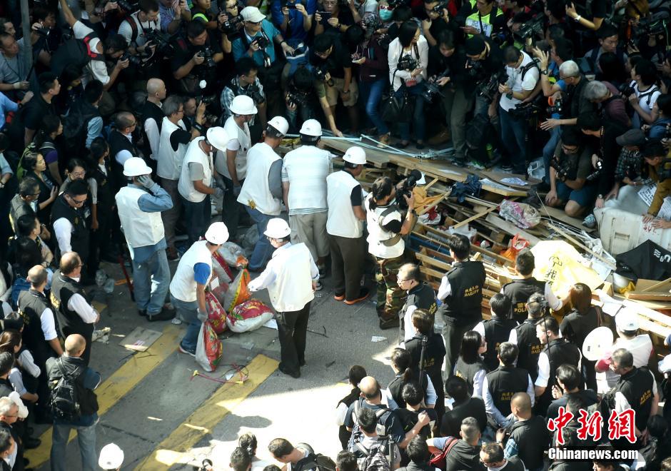 11月25日,香港法庭执达主任到达旺角亚皆老街,向在场人士宣布执行禁制令,并采取行动移除非法障碍物,现场大批警员戒备。 中新社发 张宇 摄