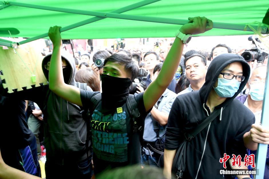 11月25日,香港法庭执达主任到达旺角亚皆老街,向在场人士宣布执行禁制令,清除非法障碍物,现场大批警员戒备。图为有示威者阻挡拆除路障。 中新社发 张宇 摄