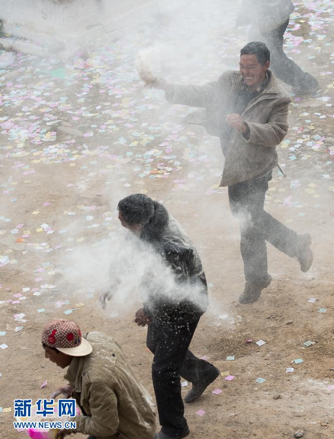 11月26日,群众在祈福活动上互撒糌粑。当日,在四川省丹巴县顶果山寺举行的“冬经”节庆上,藏族同胞把象征五谷丰登的糌粑互相抛洒。顶果山寺的“冬经”节是日嘎节的一部分。日嘎节是当地传统的封山节,每年藏历五月举行仪式宣布封山,禁止捕猎,让自然生态得以休养生息。直到冬天来临,举行日嘎节“冬经”仪式后,才可以进行狩猎和砍伐。新华社记者 江宏景 摄