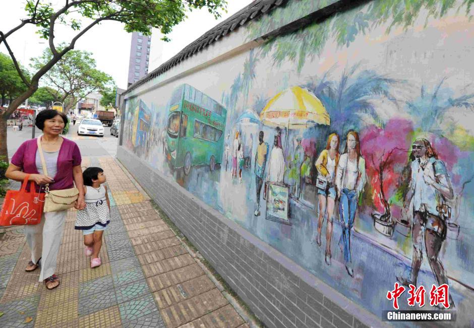 图为厦门乌石浦油画村,一排由油画村的画家们在围墙上绘出的各种油画成为街头一道靓丽风景,吸引了许多过往游客和市民的眼球。 张斌 摄