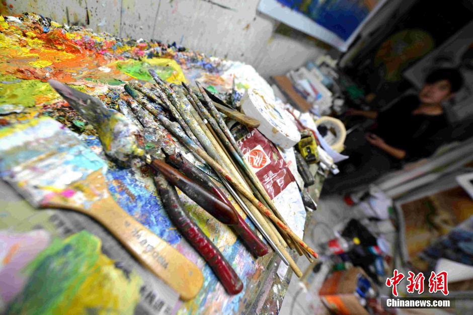 图为一块画板,几支画笔,每天这里的画师们重复着一样的生活,成为一条油画生产线。 张斌 摄