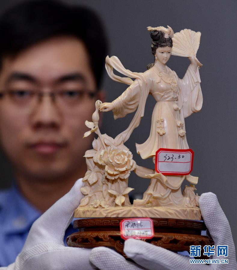 11月27日,福州海关办案人员展示被查扣的象牙制品。近日,福州海关破获一起走私珍稀动物制品案,抓获犯罪嫌疑人4名,查扣象牙制品124件、犀牛角制品1件、老虎皮一张,案值150余万元。新华社记者张国俊摄