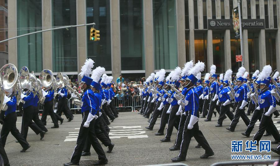 11月27日,在美国纽约曼哈顿,乐队参加感恩节大游行。当日,纽约举行第88届梅西感恩节大游行,数百万民众走上纽约街头,欣赏游行表演及各种气球造型、乐队演奏,庆祝感恩节的到来。梅西感恩节大游行始于1924年,是全美规模最大的感恩节游行。新华社记者秦朗摄