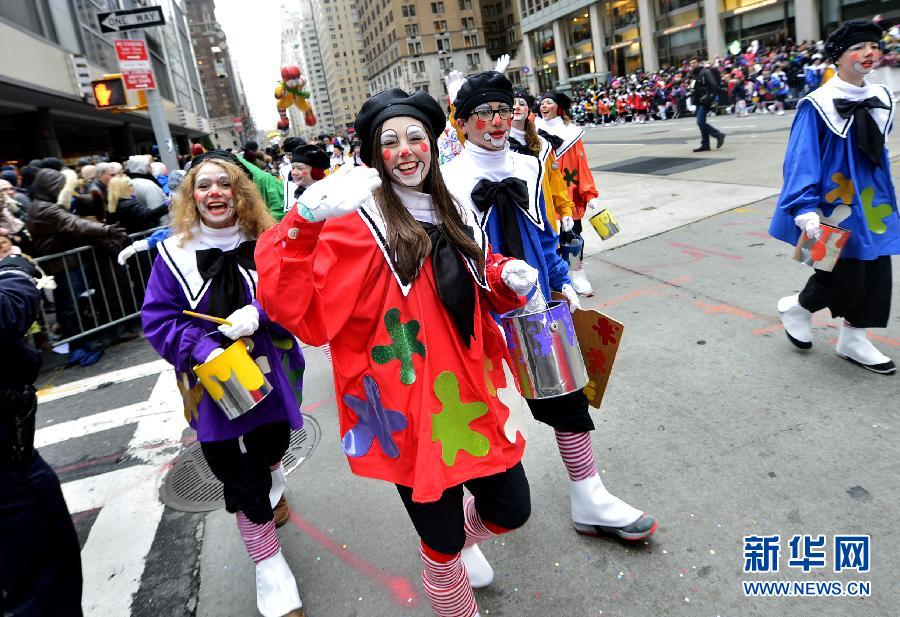 11月27日,在美国纽约曼哈顿,几名盛装打扮的表演者在感恩节庆祝游行中向观众致意。当日,纽约举行第88届梅西感恩节大游行,数百万民众走上纽约街头,欣赏游行表演及各种气球造型、乐队演奏,庆祝感恩节的到来。梅西感恩节大游行始于1924年,是全美规模最大的感恩节游行。新华社记者王雷摄