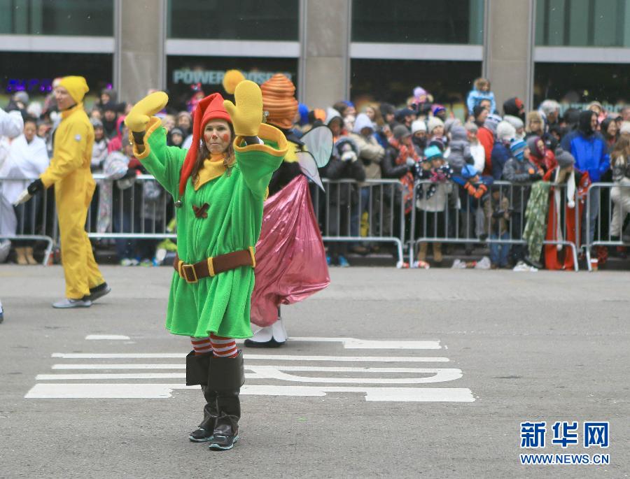 11月27日,在美国纽约曼哈顿,一名表演者在感恩节大游行中向观众致意。当日,纽约举行第88届梅西感恩节大游行,数百万民众走上纽约街头,欣赏游行表演及各种气球造型、乐队演奏,庆祝感恩节的到来。梅西感恩节大游行始于1924年,是全美规模最大的感恩节游行。新华社记者秦朗摄