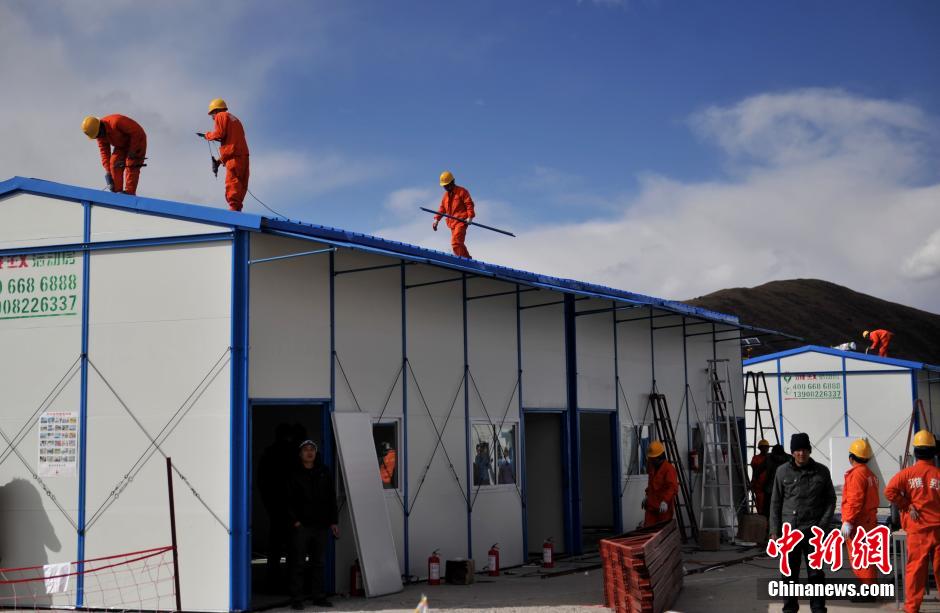 11月27日,工人师傅正在震灾区紧张搭建板房教室。当日,为了木雅祖庆学校孩子们春季开学能在宽敞、温暖、规范、安全的板房就读,四川康定震灾区首套板房教室在塔公乡江巴村木雅祖庆学校内全面搭建,安装人员克服高海拔、夜间气温低等困难,连夜搭建了六间板房教室。中新社发 刘忠俊 摄