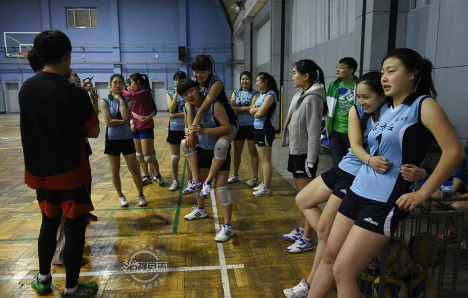 训练间隙,吕玉洁依偎在队友身边,散发小女生气息。图片来源:山西新闻网