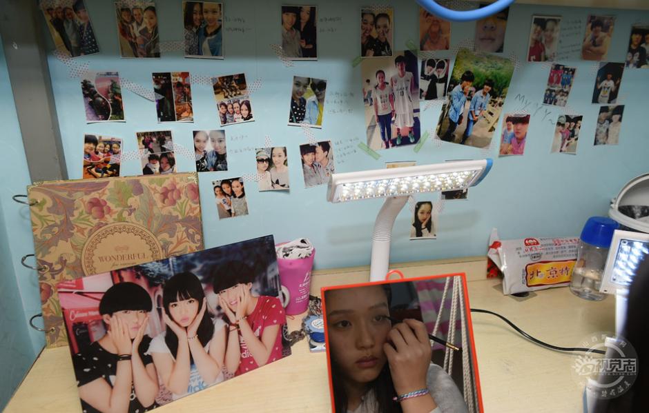 吕玉洁寝室的墙上摆满了与队友的合影,她说每张照片都是一个故事。图片来源:山西新闻网
