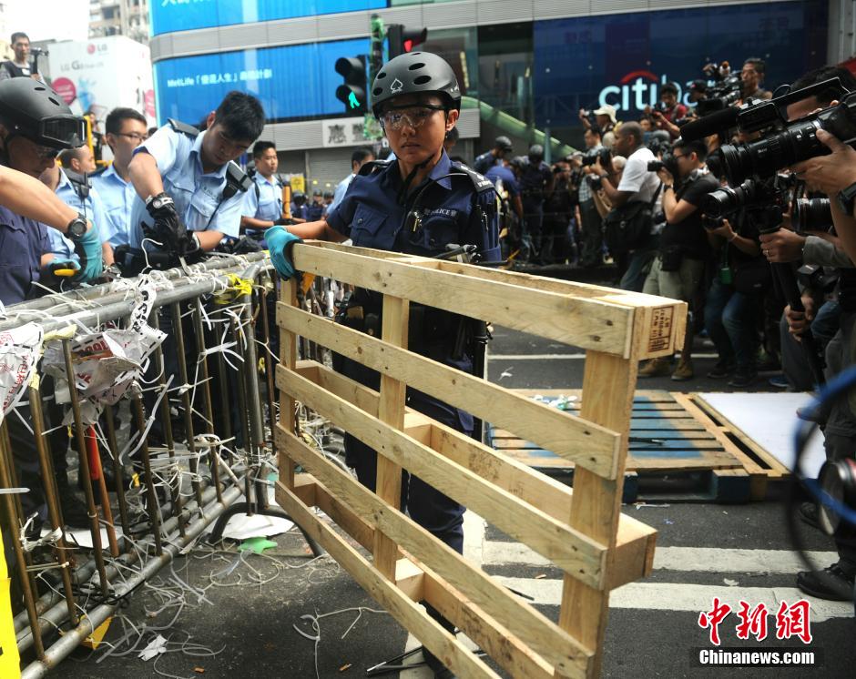 11月26日,香港非法“占领行动”进入60日,法庭执达主任在弥敦道亚皆老街交界,执行法庭的禁制令,展开清除障碍物行动。大批戴头盔的警员组成人链,协助开始清除障碍物。 中新社发 谭达明 摄