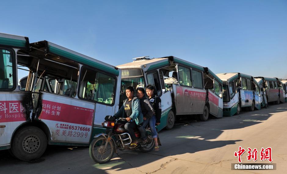 11月27日,昆明城郊云南新源报废汽车拆解中心里,待拆解的报废汽车堆积如山。据该中心陈永林副总经理介绍,自《机动车强制报废标准规定》去年5月实施以来,取消了机动车最高15年的强制报废年限后,报废汽车来源就减少了,再加上国际钢价持续走低,报废汽车业利润也随之降低。据介绍,该中心每月都要为上百辆车进行报废,主要以出售废钢铁盈利。图为待报废的公交车已经被切开。 中新社发 任东 摄