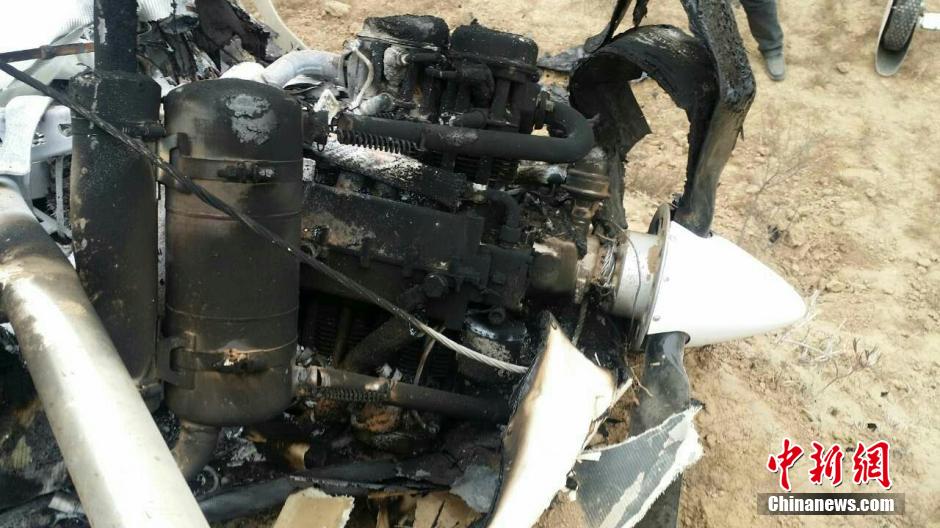 11月27日上午11点10分左右,榆林市航空运动协会所属的一架卡度士自旋翼机,在进行飞行训练时撞到高压线,于横山县塔湾镇陈大梁村境内坠毁,事故造成2名飞行人员受伤,正在医院抢救,未造成地面人员伤亡。中新社发 张远 摄