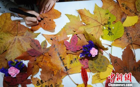 11月27日是“感恩节”,江苏扬州大学的大学生们开展了“落叶传情感恩老师”送贺卡活动,大学生们将收集的银杏、梧桐落叶进行防腐处理后制作成精美的落叶“感恩贺卡”,用落叶替代传统的纸张,在上面写满了祝福语,为默默耕耘的老师献上一份亲手制作的温馨礼物,用这种特别的方式表达学生对老师的感恩之情。