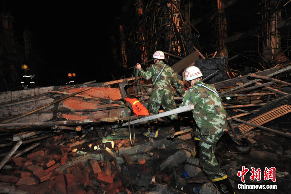 11月27日18时20分许,江西省宜春市袁州区赣西农产品批发市场三期项目施工工地发生一起混凝土浇筑坍塌事故。接警后,公安、消防赶赴现场施救。当晚20时15分左右,搜救工作结束。事故造成7人不同程度受伤送医,其中1人伤势较重,均无生命危险。图为消防官兵带着搜救犬在坍塌现场搜救被困人员。 陈乃国 摄