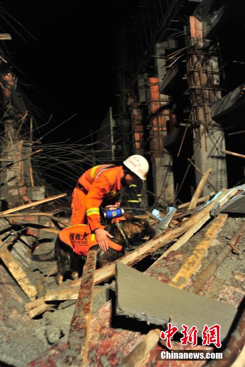 11月27日18时20分许,江西省宜春市袁州区赣西农产品批发市场三期项目施工工地发生一起混凝土浇筑坍塌事故。接警后,公安、消防赶赴现场施救。当晚20时15分左右,搜救工作结束。事故造成7人不同程度受伤送医,其中1人伤势较重,均无生命危险。图为消防官兵带着搜救犬在坍塌现场搜救被困人员。陈乃国 摄
