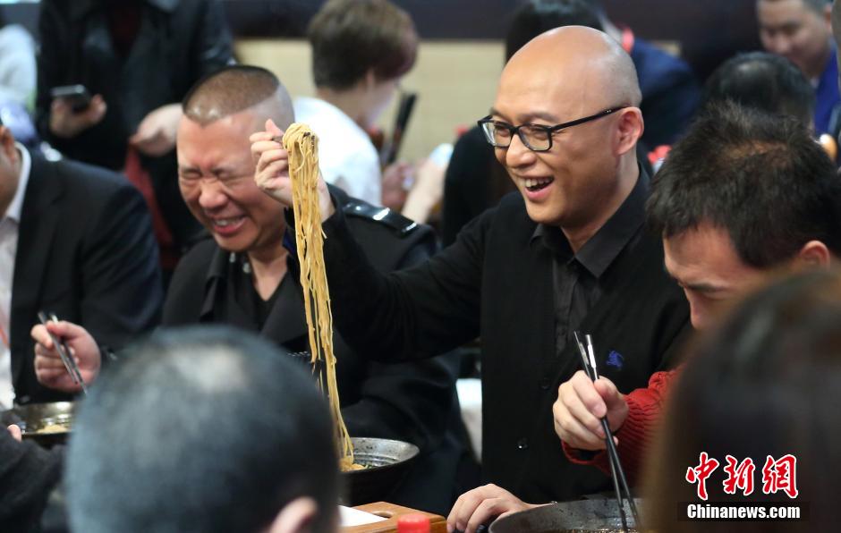 11月28日,相声演员郭德纲(左)与主持人孟非(中)与嘉宾们一起吃面条。当日,江苏卫视主持人孟非位于南京河西万达广场的面馆“孟非的小面”开业,郭德纲、黄健翔、黄菡等一众好友赶来捧场。 中新社发 泱波 摄