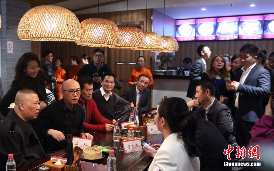 11月28日,相声演员郭德纲(左)与主持人孟非(左二)与嘉宾们一起吃面条。当日,江苏卫视主持人孟非位于南京河西万达广场的面馆“孟非的小面”开业,郭德纲、黄健翔、黄菡等一众好友赶来捧场。 中新社发 泱波 摄