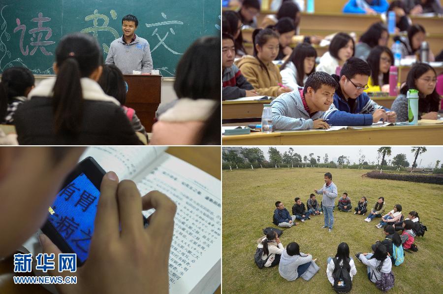 这是一张拼版照片:左上:11月26日,张耀东参加读书交流会,畅谈读书心得。 右上:11月26日,张耀东和同学一起在课堂上听课。左下:11月26日,张耀东借助电子放大镜读书。右下:11月26日,张耀东为同学们表演秦腔。凭借着拉二胡和唱秦腔的本领,张耀东参加了基础医学院学生会文艺部。今年18岁的张耀东来自甘肃天水,小时候因视神经萎缩导致左眼失明,右眼视力仅有0.02,在医学上被认定为盲人。今年夏天,张耀东通过高考进入湖北省中医药大学,成为我国第一位通过全国统一考试被大学录取的盲人。眼下,张耀东正在湖北省中医药大学基础医学院学习。虽然学习生活多有不便,但他相信通过付出更多的时间与努力,自己一定会圆满完成学业。 3月28日,教育部下发《关于做好2014年普通高校招生工作的通知》,提出“有盲人参加考试时,为盲人考生提供盲文试卷、电子试卷或由专门的工作人员予以协助。”为盲人参加高考提供了条件。据介绍,张耀东参加高考时,当地教育主管部门为他专设一人考场,考卷文字也放大到了一号大小,仅文综一门的试卷就厚达67页。新华社记者 程敏 摄