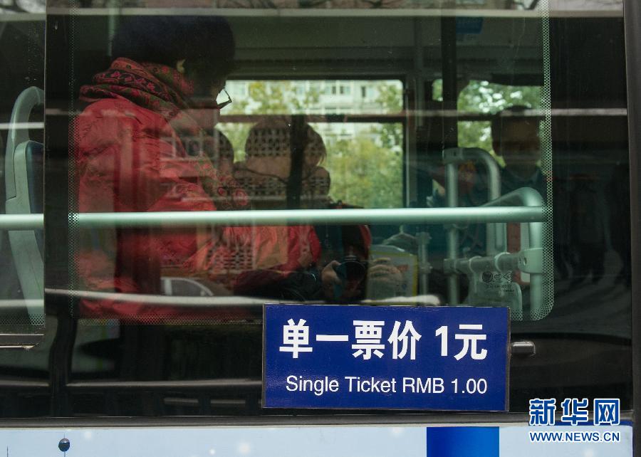 11月27日,一名乘客在北京宣武门附近乘坐公交车,公交车车身上显示“单一票价1元”的字样。