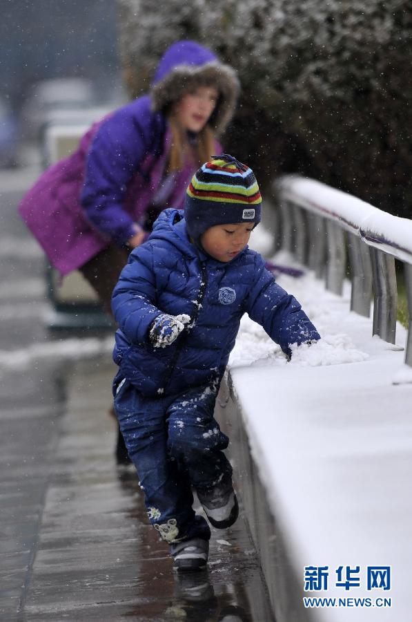 11月27日,在宁夏银川市光明广场,一名小朋友在雪中玩耍。当日,宁夏银川市迎来今冬的首场降雪,未来几日全区多地将迎来雨雪和降温天气,降温达4到6摄氏度。 新华社记者 李然 摄