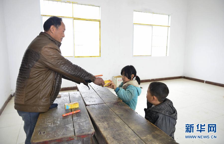 11月26日中午,袁本安(左)给两名学生发放营养午餐。
